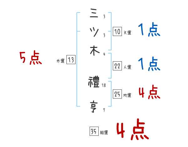 天運![]() | 三ツ木禮亨さんの天運は10画の1つ星!不安を感じやすい傾向。ストレスを抱えないように注意しましょう。 家系が持つ宿命的な運勢を表します。祖先から受け継いだ苗字ですので自分の力が及びません。家柄を象徴します。 |