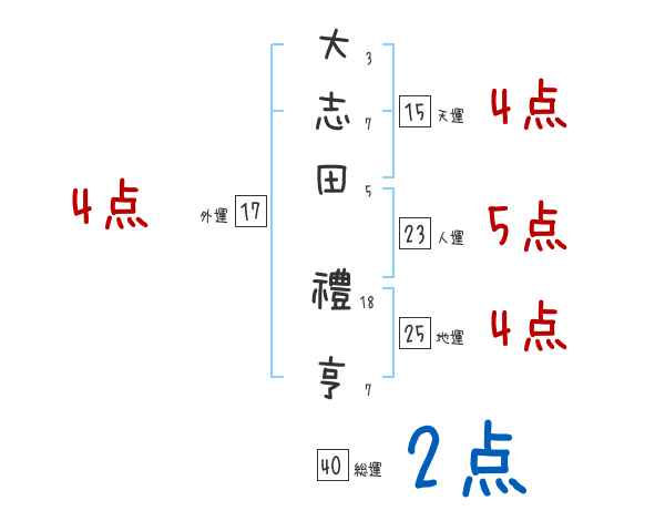 外運![]() | 大志田禮亨さんの外運は17画の4つ星!積極的な行動力。地位を気づき財産を手に入れる。純粋な心と直感力。 生活面を象徴する運勢です。外部から受ける影響力を表し、結婚運、家庭運や職場、環境への順応性を表します。 |
