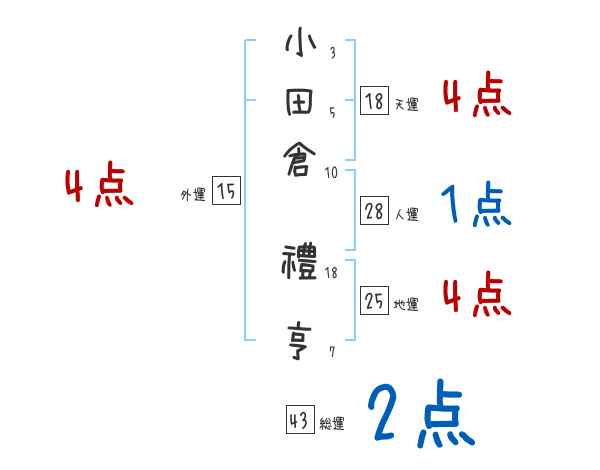 天運![]() | 小田倉禮亨さんの天運は18画の4つ星!情熱的で剛気。忍耐力があり信頼される。 家系が持つ宿命的な運勢を表します。祖先から受け継いだ苗字ですので自分の力が及びません。家柄を象徴します。 |