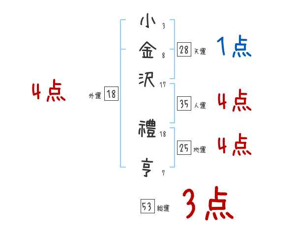 総運![]() | 小金沢禮亨さんの総運は53画の3つ星!やや見栄っ張りで虚栄心がある。散財に注意。 あなたの人生を表す1番重要な運勢です。生涯を通じて影響する総合運となり、主に50歳以降の晩年期に影響を及ぼします。 |