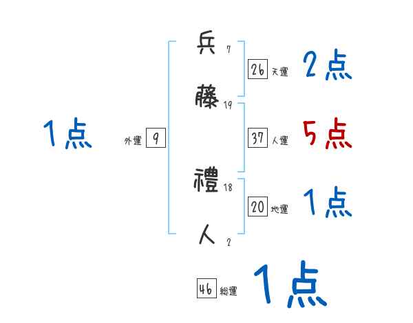 天運![]() | 兵藤禮人さんの天運は26画の2つ星!波瀾万丈かも。信頼できる人を大事にしましょう。 家系が持つ宿命的な運勢を表します。祖先から受け継いだ苗字ですので自分の力が及びません。家柄を象徴します。 |