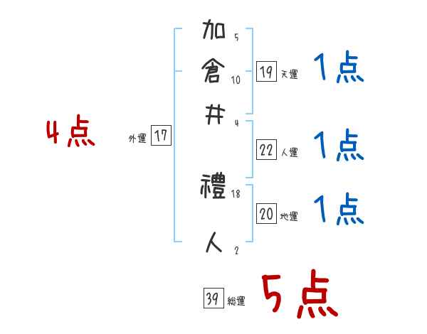 外運![]() | 加倉井禮人さんの外運は17画の4つ星!積極的な行動力。地位を気づき財産を手に入れる。純粋な心と直感力。 生活面を象徴する運勢です。外部から受ける影響力を表し、結婚運、家庭運や職場、環境への順応性を表します。 |