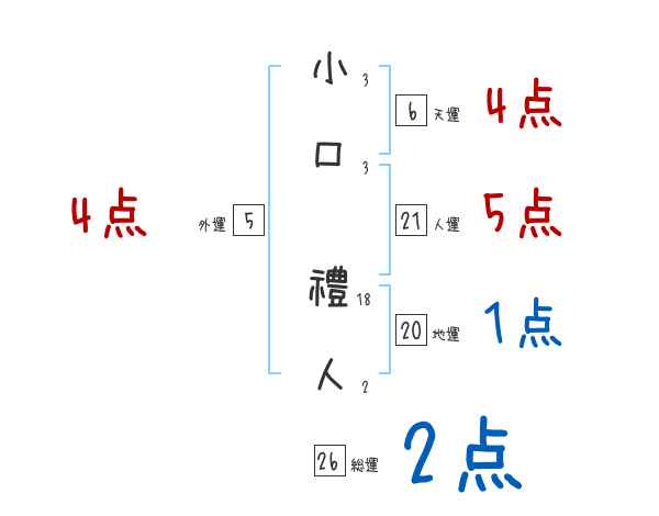 天運![]() | 小口禮人さんの天運は6画の4つ星!慎重な努力家で信頼を得る。誠実な精神で向上心に優れる。 家系が持つ宿命的な運勢を表します。祖先から受け継いだ苗字ですので自分の力が及びません。家柄を象徴します。 |