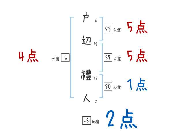 天運![]() | 戸辺禮人さんの天運は23画の5つ星!想像力に優れ活力がある。一代で成功し名誉を手に入れる。 家系が持つ宿命的な運勢を表します。祖先から受け継いだ苗字ですので自分の力が及びません。家柄を象徴します。 |