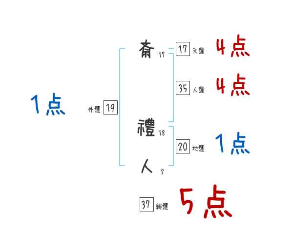人運![]() | 斎禮人さんの人運は35画の4つ星!温厚な性格で感受性が高い。穏和な性格で人望が厚い。 性格や才能などを表す2番目に重要な運勢です。人間関係や協調性、社会的な成功に影響します。主に20歳から50歳ぐらいまでの中年期の運勢を表します。 |