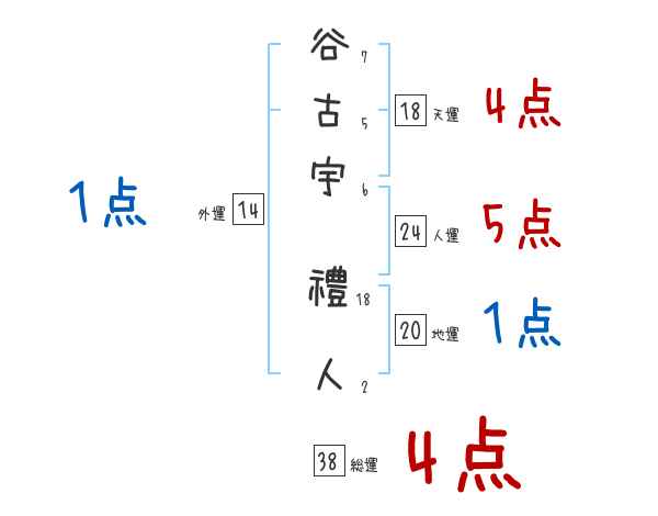 人運![]() | 谷古宇禮人さんの人運は24画の5つ星!家庭運が良く順調な人生。金運にも恵まれる。 性格や才能などを表す2番目に重要な運勢です。人間関係や協調性、社会的な成功に影響します。主に20歳から50歳ぐらいまでの中年期の運勢を表します。 |