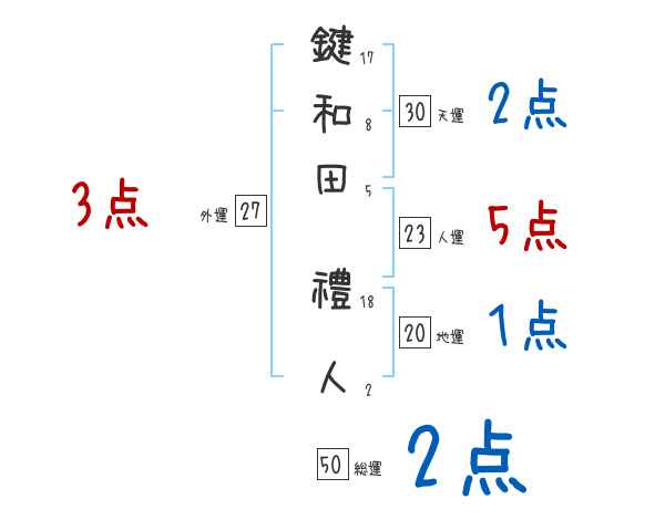 人運![]() | 鍵和田禮人さんの人運は23画の5つ星!想像力に優れ活力がある。一代で成功し名誉を手に入れる。 性格や才能などを表す2番目に重要な運勢です。人間関係や協調性、社会的な成功に影響します。主に20歳から50歳ぐらいまでの中年期の運勢を表します。 |