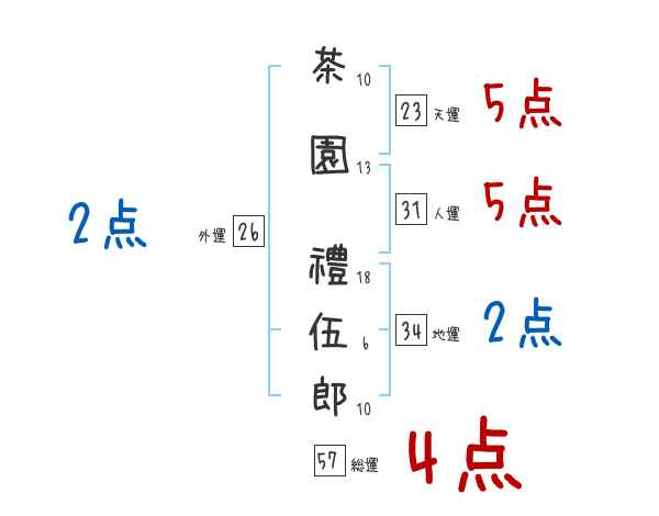 天運![]() | 茶園禮伍郎さんの天運は23画の5つ星!想像力に優れ活力がある。一代で成功し名誉を手に入れる。 家系が持つ宿命的な運勢を表します。祖先から受け継いだ苗字ですので自分の力が及びません。家柄を象徴します。 |
