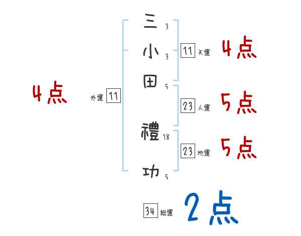 天運![]() | 三小田禮功さんの天運は11画の4つ星!着実に富や地位を得る幸運な人生。 家系が持つ宿命的な運勢を表します。祖先から受け継いだ苗字ですので自分の力が及びません。家柄を象徴します。 |