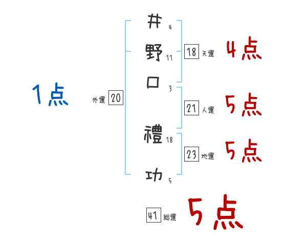 総運![]() | 井野口禮功さんの総運は41画の5つ星!大志を抱き、目標に向かって実力を発揮し達成する。温和な性格。 あなたの人生を表す1番重要な運勢です。生涯を通じて影響する総合運となり、主に50歳以降の晩年期に影響を及ぼします。 |