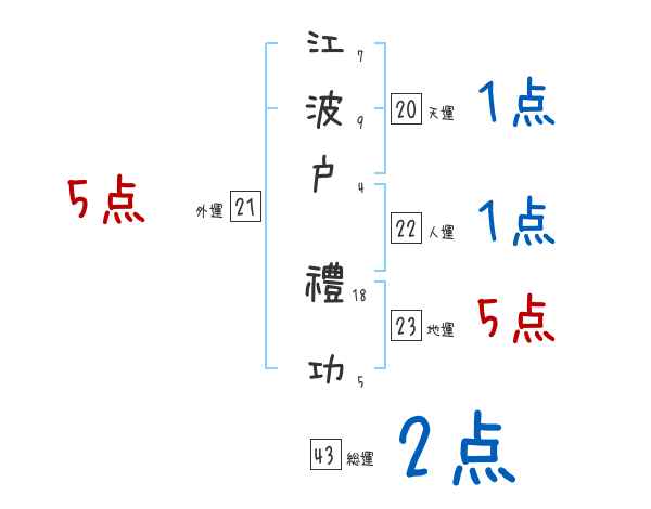 外運![]() | 江波戸禮功さんの外運は21画の5つ星!統率力がある。独立し成功する。名誉を手に入れる。 生活面を象徴する運勢です。外部から受ける影響力を表し、結婚運、家庭運や職場、環境への順応性を表します。 |