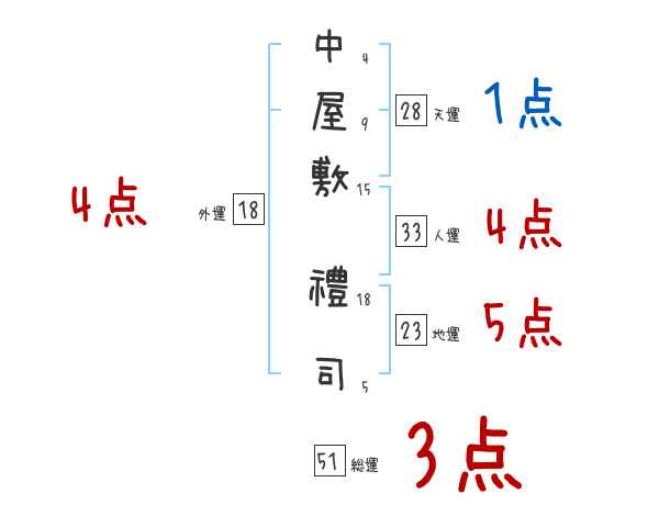 外運![]() | 中屋敷禮司さんの外運は18画の4つ星!情熱的で剛気。忍耐力があり信頼される。 生活面を象徴する運勢です。外部から受ける影響力を表し、結婚運、家庭運や職場、環境への順応性を表します。 |