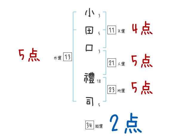 総運![]() | 小田口禮司さんの総運は34画の2つ星!独創性に優れるが、自尊心が強く災難に注意しましょう。 あなたの人生を表す1番重要な運勢です。生涯を通じて影響する総合運となり、主に50歳以降の晩年期に影響を及ぼします。 |