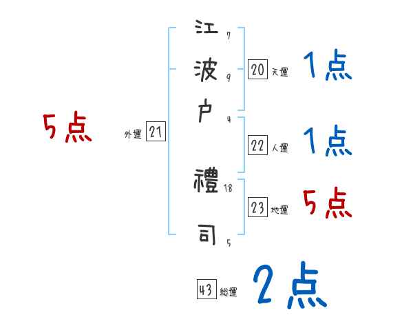 外運![]() | 江波戸禮司さんの外運は21画の5つ星!統率力がある。独立し成功する。名誉を手に入れる。 生活面を象徴する運勢です。外部から受ける影響力を表し、結婚運、家庭運や職場、環境への順応性を表します。 |