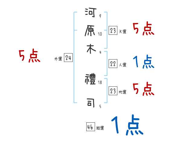天運![]() | 河原木禮司さんの天運は23画の5つ星!想像力に優れ活力がある。一代で成功し名誉を手に入れる。 家系が持つ宿命的な運勢を表します。祖先から受け継いだ苗字ですので自分の力が及びません。家柄を象徴します。 |