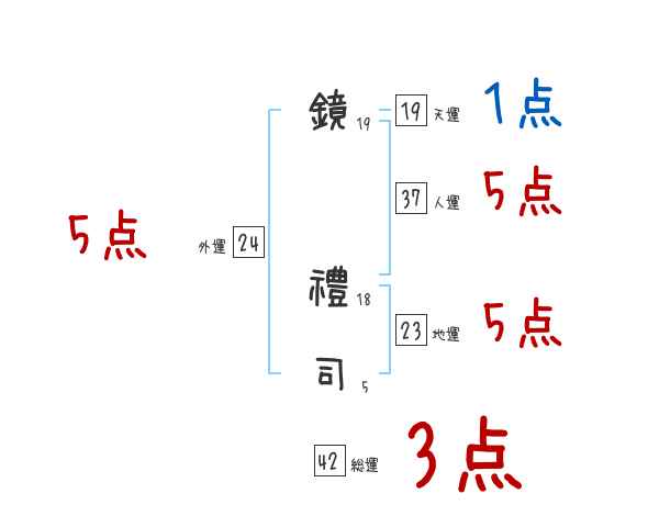 天運![]() | 鏡禮司さんの天運は19画の1つ星!優れた才能を持ちますが、協調性が足りないことも。周りの人と協力する事を意識しましょう。 家系が持つ宿命的な運勢を表します。祖先から受け継いだ苗字ですので自分の力が及びません。家柄を象徴します。 |