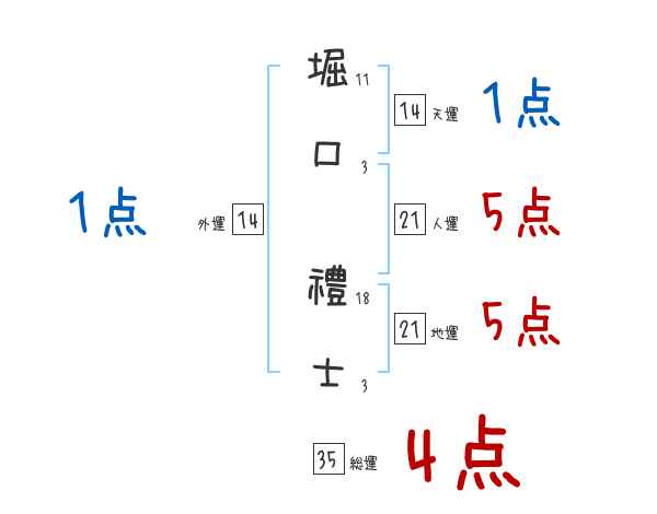 外運![]() | 堀口禮士さんの外運は14画の1つ星!人に対して優しいがストレスを溜め込みがち。人間関係のトラブルを避けるよう気をつけましょう。 生活面を象徴する運勢です。外部から受ける影響力を表し、結婚運、家庭運や職場、環境への順応性を表します。 |
