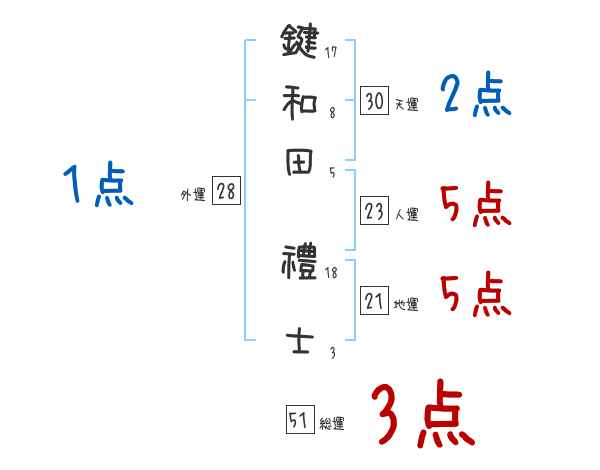 天運![]() | 鍵和田禮士さんの天運は30画の2つ星!浮き沈みの激しさに注意しましょう。 家系が持つ宿命的な運勢を表します。祖先から受け継いだ苗字ですので自分の力が及びません。家柄を象徴します。 |