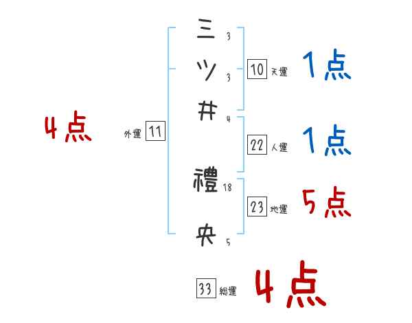 総運![]() | 三ツ井禮央さんの総運は33画の4つ星!権力志向でプライドが高い。勇気があり運を切り開き成功する。 あなたの人生を表す1番重要な運勢です。生涯を通じて影響する総合運となり、主に50歳以降の晩年期に影響を及ぼします。 |