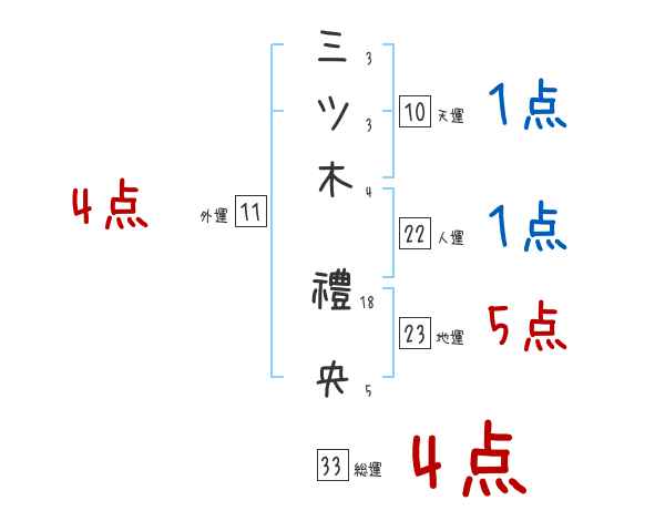 外運![]() | 三ツ木禮央さんの外運は11画の4つ星!着実に富や地位を得る幸運な人生。 生活面を象徴する運勢です。外部から受ける影響力を表し、結婚運、家庭運や職場、環境への順応性を表します。 |