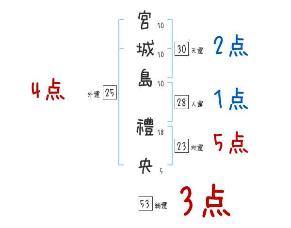 総運![]() | 宮城島禮央さんの総運は53画の3つ星!やや見栄っ張りで虚栄心がある。散財に注意。 あなたの人生を表す1番重要な運勢です。生涯を通じて影響する総合運となり、主に50歳以降の晩年期に影響を及ぼします。 |