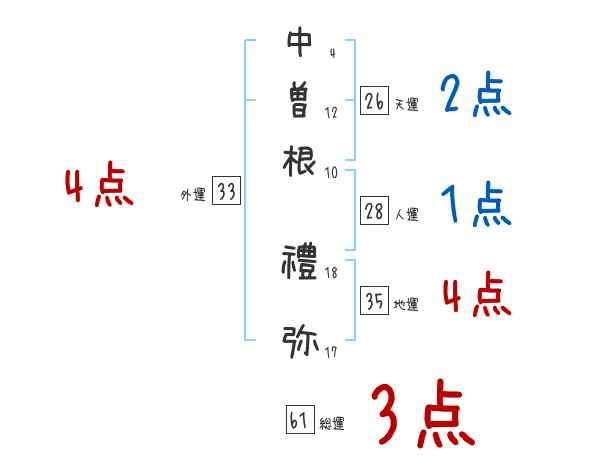 外運![]() | 中曽根禮弥さんの外運は33画の4つ星!権力志向でプライドが高い。勇気があり運を切り開き成功する。 生活面を象徴する運勢です。外部から受ける影響力を表し、結婚運、家庭運や職場、環境への順応性を表します。 |