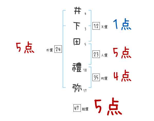 総運![]() | 井下田禮弥さんの総運は47画の5つ星!実力が開花し発展する円満な人生。財に恵まれる。 あなたの人生を表す1番重要な運勢です。生涯を通じて影響する総合運となり、主に50歳以降の晩年期に影響を及ぼします。 |