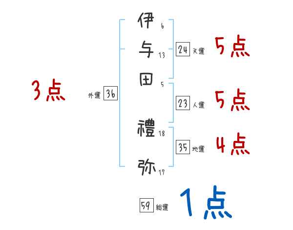 天運![]() | 伊与田禮弥さんの天運は24画の5つ星!家庭運が良く順調な人生。金運にも恵まれる。 家系が持つ宿命的な運勢を表します。祖先から受け継いだ苗字ですので自分の力が及びません。家柄を象徴します。 |