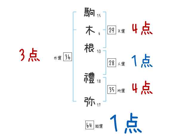 外運![]() | 駒木根禮弥さんの外運は36画の3つ星!先見性が豊かです。多少神経質で苦労することも。 生活面を象徴する運勢です。外部から受ける影響力を表し、結婚運、家庭運や職場、環境への順応性を表します。 |