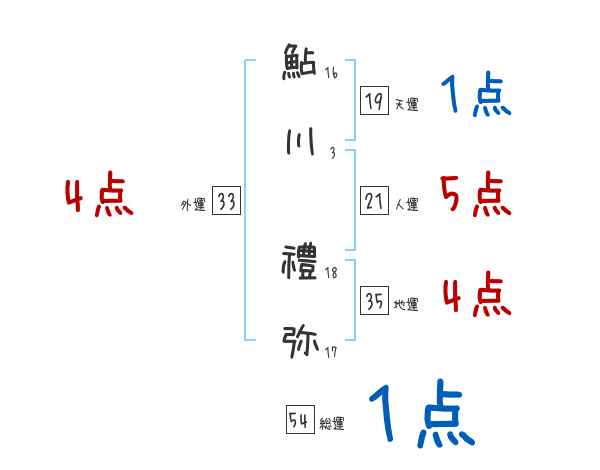 外運![]() | 鮎川禮弥さんの外運は33画の4つ星!権力志向でプライドが高い。勇気があり運を切り開き成功する。 生活面を象徴する運勢です。外部から受ける影響力を表し、結婚運、家庭運や職場、環境への順応性を表します。 |
