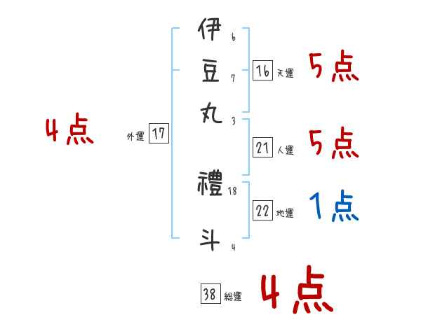 外運![]() | 伊豆丸禮斗さんの外運は17画の4つ星!積極的な行動力。地位を気づき財産を手に入れる。純粋な心と直感力。 生活面を象徴する運勢です。外部から受ける影響力を表し、結婚運、家庭運や職場、環境への順応性を表します。 |