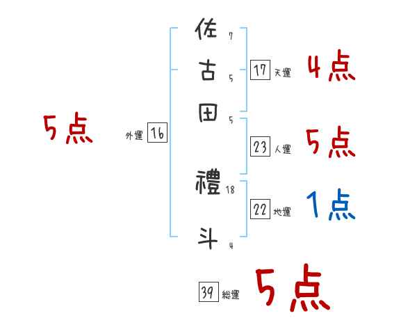 外運![]() | 佐古田禮斗さんの外運は16画の5つ星!人望が厚く大きく発展する。逆転成功が見える。 生活面を象徴する運勢です。外部から受ける影響力を表し、結婚運、家庭運や職場、環境への順応性を表します。 |