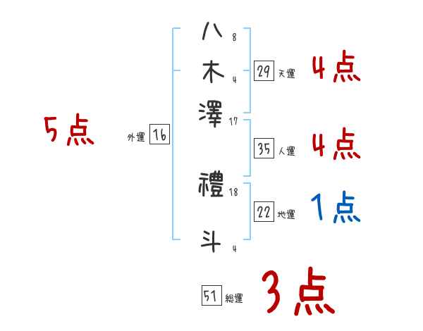天運![]() | 八木澤禮斗さんの天運は29画の4つ星!完全主義で才能がある。厳格な心の持ち主。 家系が持つ宿命的な運勢を表します。祖先から受け継いだ苗字ですので自分の力が及びません。家柄を象徴します。 |