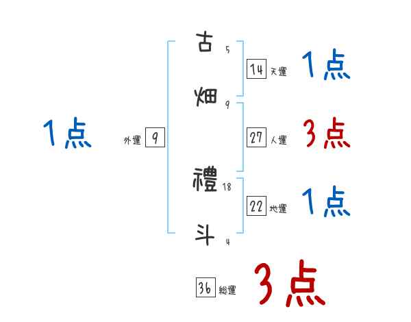 総運![]() | 古畑禮斗さんの総運は36画の3つ星!先見性が豊かです。多少神経質で苦労することも。 あなたの人生を表す1番重要な運勢です。生涯を通じて影響する総合運となり、主に50歳以降の晩年期に影響を及ぼします。 |