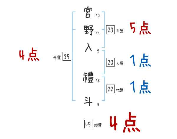 天運![]() | 宮野入禮斗さんの天運は23画の5つ星!想像力に優れ活力がある。一代で成功し名誉を手に入れる。 家系が持つ宿命的な運勢を表します。祖先から受け継いだ苗字ですので自分の力が及びません。家柄を象徴します。 |