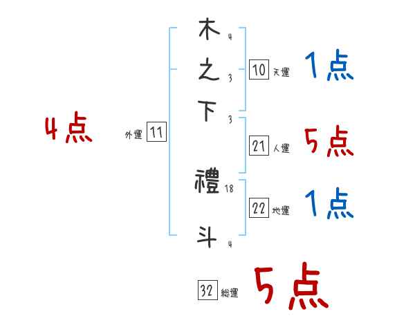 総運![]() | 木之下禮斗さんの総運は32画の5つ星!柔軟性があり成功する。チャンスが多く金運が良い。 あなたの人生を表す1番重要な運勢です。生涯を通じて影響する総合運となり、主に50歳以降の晩年期に影響を及ぼします。 |