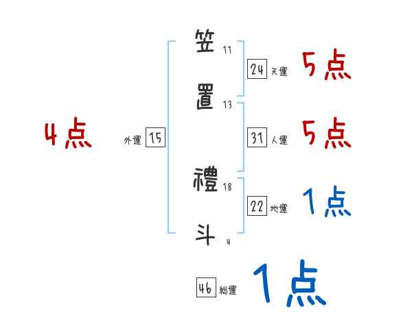 天運![]() | 笠置禮斗さんの天運は24画の5つ星!家庭運が良く順調な人生。金運にも恵まれる。 家系が持つ宿命的な運勢を表します。祖先から受け継いだ苗字ですので自分の力が及びません。家柄を象徴します。 |