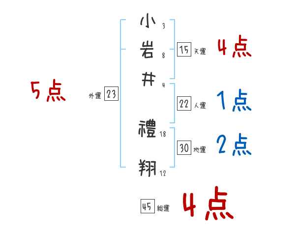 外運![]() | 小岩井禮翔さんの外運は23画の5つ星!想像力に優れ活力がある。一代で成功し名誉を手に入れる。 生活面を象徴する運勢です。外部から受ける影響力を表し、結婚運、家庭運や職場、環境への順応性を表します。 |