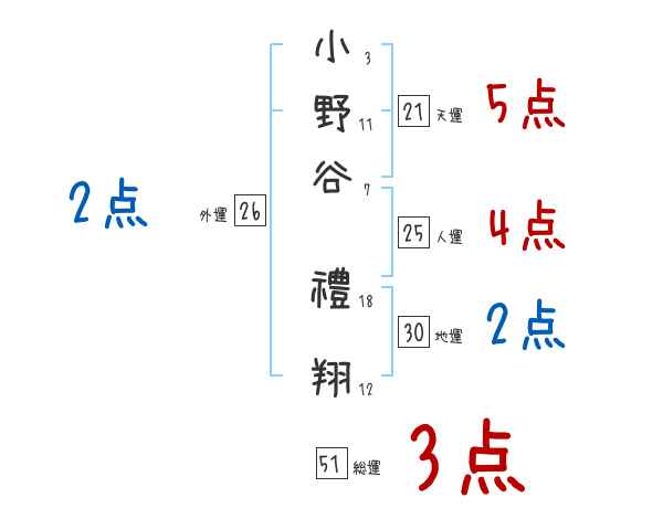 外運![]() | 小野谷禮翔さんの外運は26画の2つ星!波瀾万丈かも。信頼できる人を大事にしましょう。 生活面を象徴する運勢です。外部から受ける影響力を表し、結婚運、家庭運や職場、環境への順応性を表します。 |