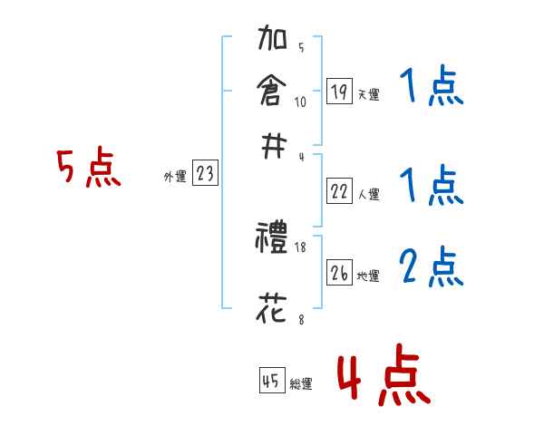 天運![]() | 加倉井禮花さんの天運は19画の1つ星!優れた才能を持ちますが、協調性が足りないことも。周りの人と協力する事を意識しましょう。 家系が持つ宿命的な運勢を表します。祖先から受け継いだ苗字ですので自分の力が及びません。家柄を象徴します。 |