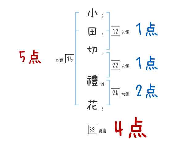 外運![]() | 小田切禮花さんの外運は16画の5つ星!人望が厚く大きく発展する。逆転成功が見える。 生活面を象徴する運勢です。外部から受ける影響力を表し、結婚運、家庭運や職場、環境への順応性を表します。 |
