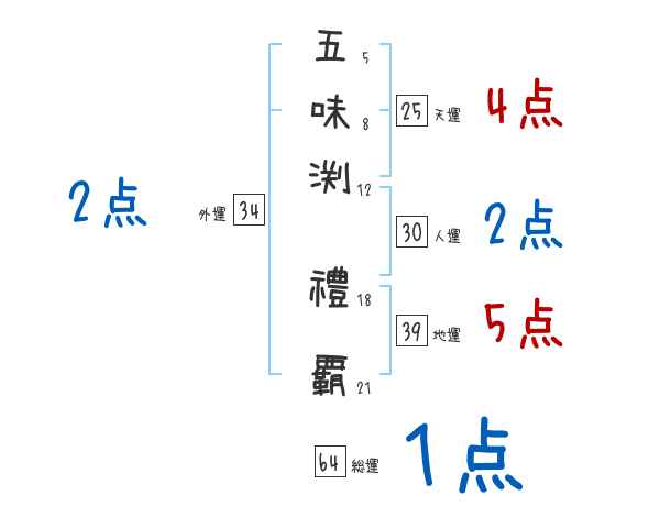 外運![]() | 五味渕禮覇さんの外運は34画の2つ星!独創性に優れるが、自尊心が強く災難に注意しましょう。 生活面を象徴する運勢です。外部から受ける影響力を表し、結婚運、家庭運や職場、環境への順応性を表します。 |