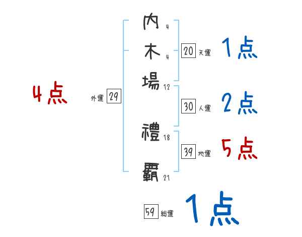 外運![]() | 内木場禮覇さんの外運は29画の4つ星!完全主義で才能がある。厳格な心の持ち主。 生活面を象徴する運勢です。外部から受ける影響力を表し、結婚運、家庭運や職場、環境への順応性を表します。 |
