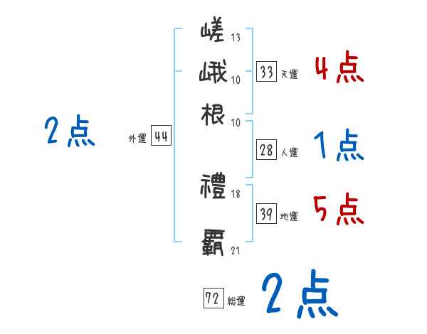 天運![]() | 嵯峨根禮覇さんの天運は33画の4つ星!権力志向でプライドが高い。勇気があり運を切り開き成功する。 家系が持つ宿命的な運勢を表します。祖先から受け継いだ苗字ですので自分の力が及びません。家柄を象徴します。 |