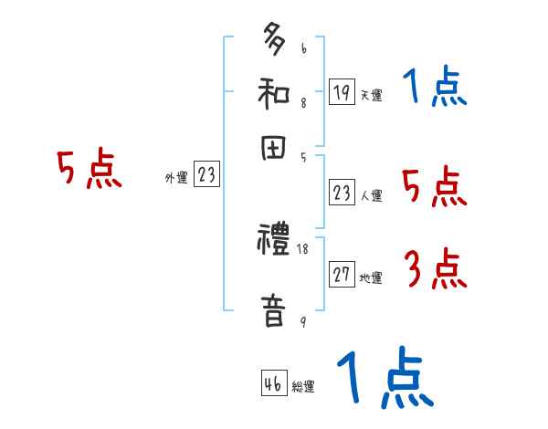 人運![]() | 多和田禮音さんの人運は23画の5つ星!想像力に優れ活力がある。一代で成功し名誉を手に入れる。 性格や才能などを表す2番目に重要な運勢です。人間関係や協調性、社会的な成功に影響します。主に20歳から50歳ぐらいまでの中年期の運勢を表します。 |