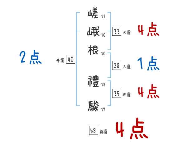 総運![]() | 嵯峨根禮駿さんの総運は68画の4つ星!潜在能力が高く集中力が高い。勤勉に励み発展する。 あなたの人生を表す1番重要な運勢です。生涯を通じて影響する総合運となり、主に50歳以降の晩年期に影響を及ぼします。 |