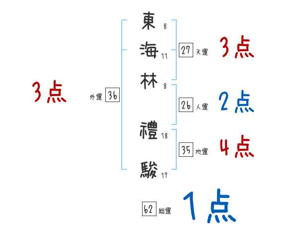 外運![]() | 東海林禮駿さんの外運は36画の3つ星!先見性が豊かです。多少神経質で苦労することも。 生活面を象徴する運勢です。外部から受ける影響力を表し、結婚運、家庭運や職場、環境への順応性を表します。 |