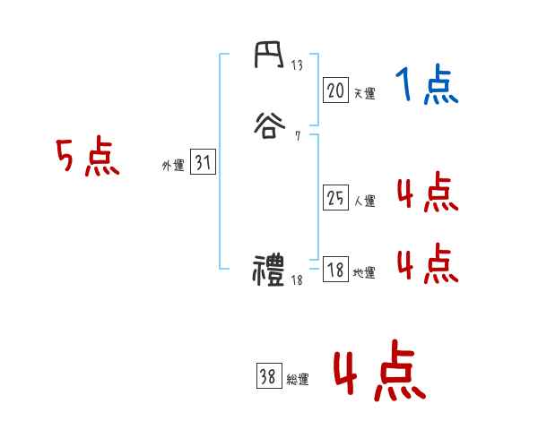 外運![]() | 円谷禮さんの外運は31画の5つ星!社交性があり判断力に優れる。順風満帆な人生で円満な生活。 生活面を象徴する運勢です。外部から受ける影響力を表し、結婚運、家庭運や職場、環境への順応性を表します。 |