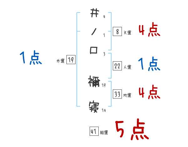 外運![]() | 井ノ口禰寝さんの外運は19画の1つ星!優れた才能を持ちますが、協調性が足りないことも。周りの人と協力する事を意識しましょう。 生活面を象徴する運勢です。外部から受ける影響力を表し、結婚運、家庭運や職場、環境への順応性を表します。 |