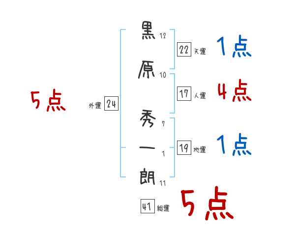 天運![]() | 黒原秀一朗さんの天運は22画の1つ星!努力することが苦手ないっぽう手先が器用。芸術性にも優れる。 家系が持つ宿命的な運勢を表します。祖先から受け継いだ苗字ですので自分の力が及びません。家柄を象徴します。 |